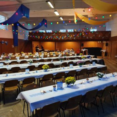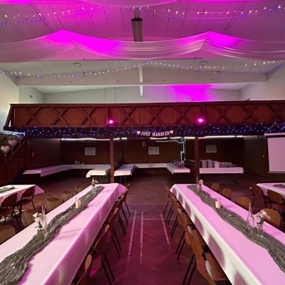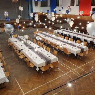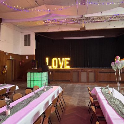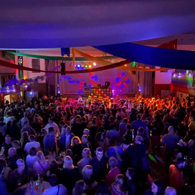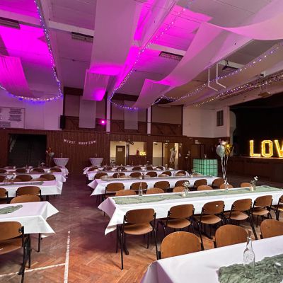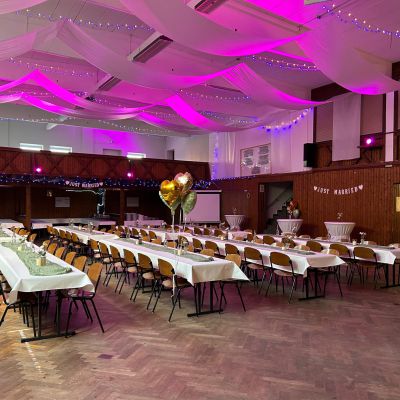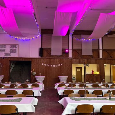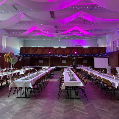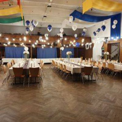 Unsere Jahnhalle umfasst einen ca. 350 qm großen Saal, eine Bühne, eine Empore und eine Bar, eine Küche und der Kühlraum sind ebenfalls fester Bestandteil und kann natürlich individuell nach Ihren Wünschen und Bedürfnissen gemietet werden.