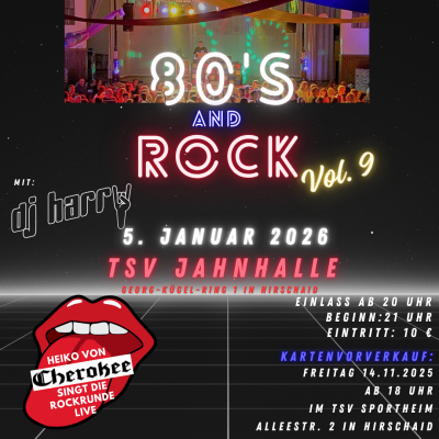 Am 05.01.2026 ist es wieder soweit! Wir starten in Vol. 9 der 80er Party mit unserem DJ Harry. Der Kartenvorverkauf findet am Freitag, den 14.11.2025 ab 18 Uhr im TSV Vereinsheim statt. Eintritt 10 EUR, Einlass ab 20 Uhr und Beginn um 21 Uhr. Karten gibt es solange der Vorrat reicht. Als besonderes Highlight, freuen wir uns, dass Heiko von Cherokee die Rockrunde live singt!