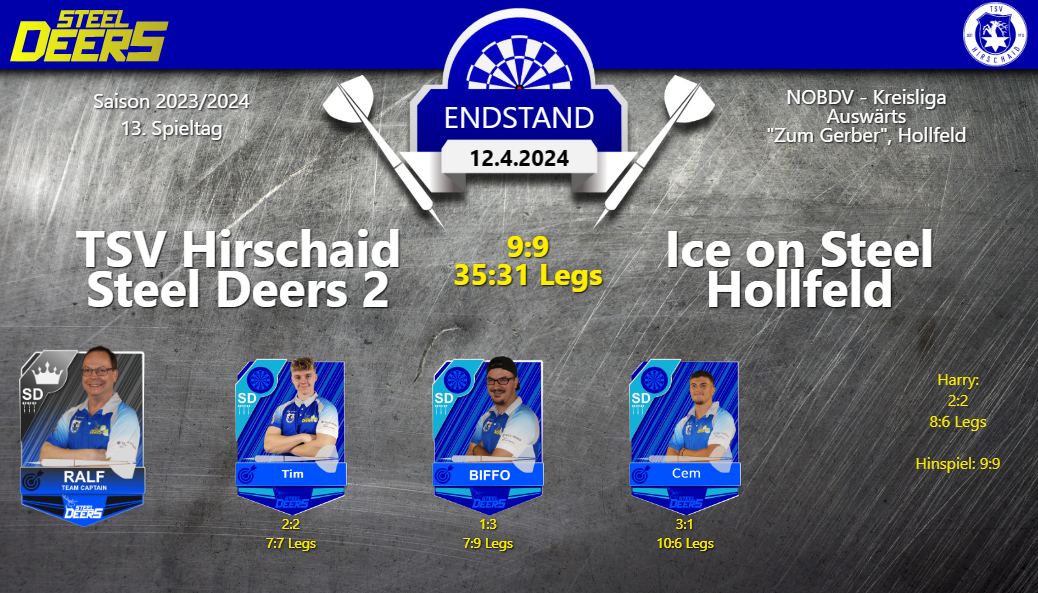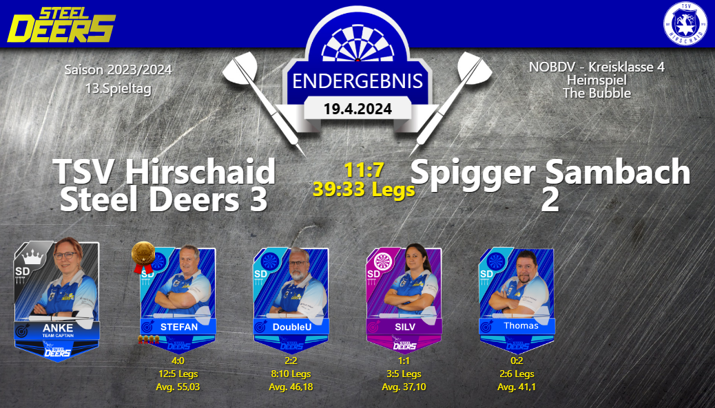 TSV Hirschaid Steel Deers 3 vs. Spigger Sambach 2 – 11:7 (39:33 Legs/Hinspiel: 8:10)